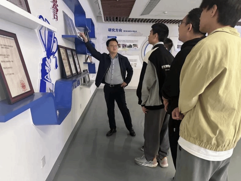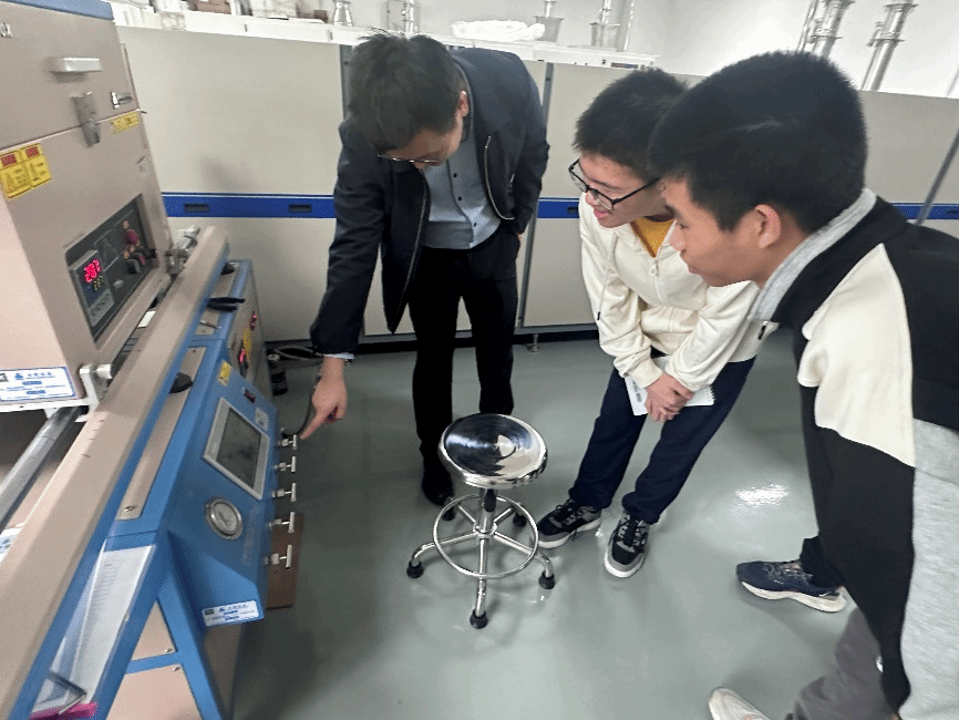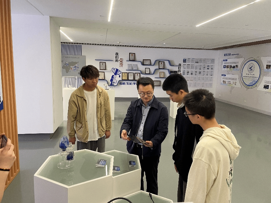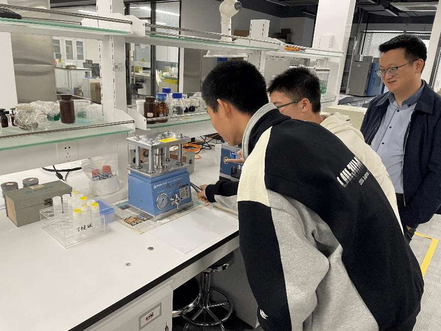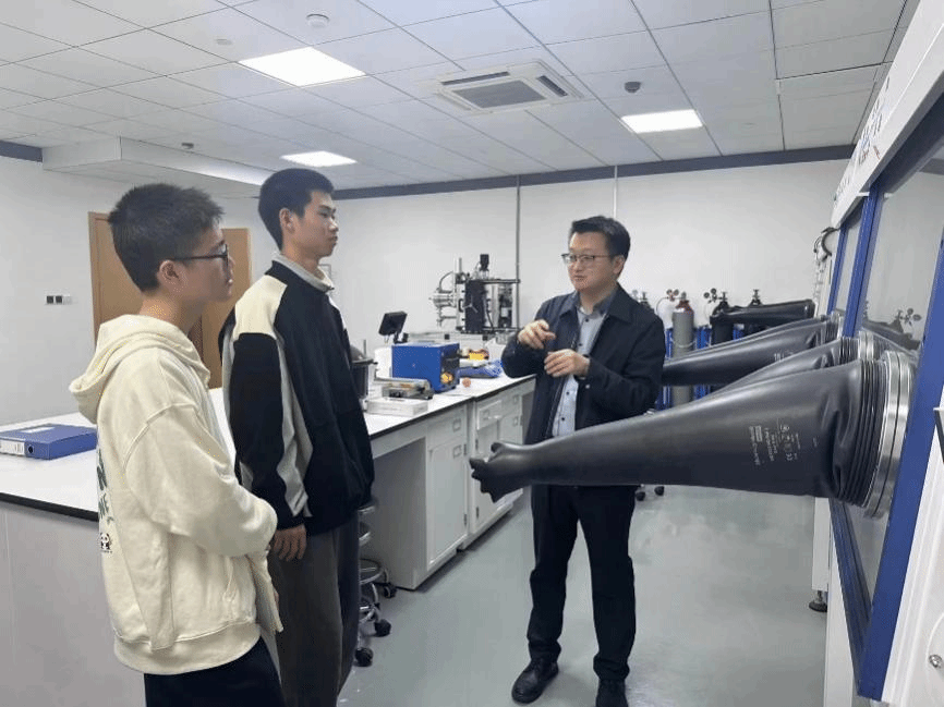 官操教授首先带领学生参观了创新成果展厅,介绍了黄维院士柔性电子团队的发展历程。学生们对钙钛矿光伏电池、水系碱性锌电池、3D打印离子电池等前沿成果叹为观止,兴趣浓厚。随后官操教授了解了学生们的基本情况,回顾并肯定了学生面试过程中展现的创新思维。他指出,“英才计划”不拘一格,在原来传统的科技人才的培养体制之余,犹如开辟了一条别具一格的“高速公路”,为那些对科学研究有着浓厚兴趣并希望进一步深入探究的中学生提供了一个有效途径,让他们有机会提前“上大学”,与大学导师及领域专家面对面交流,并最大限度地利用大学导师及实验室资源进行“科研活动”。然后从个人求学经历和工作经验出发,结合“擅长的”和“喜欢的”两个方面,引导学生发现自我,思考建立长期的个人目标和规划,不再局限于高考、大学这种阶段性的成绩。最后,学生们参观了材料合成实验室、材料分析测试实验室、以及电池组装和测试实验室,并自己动手组装了一颗纽扣电池。