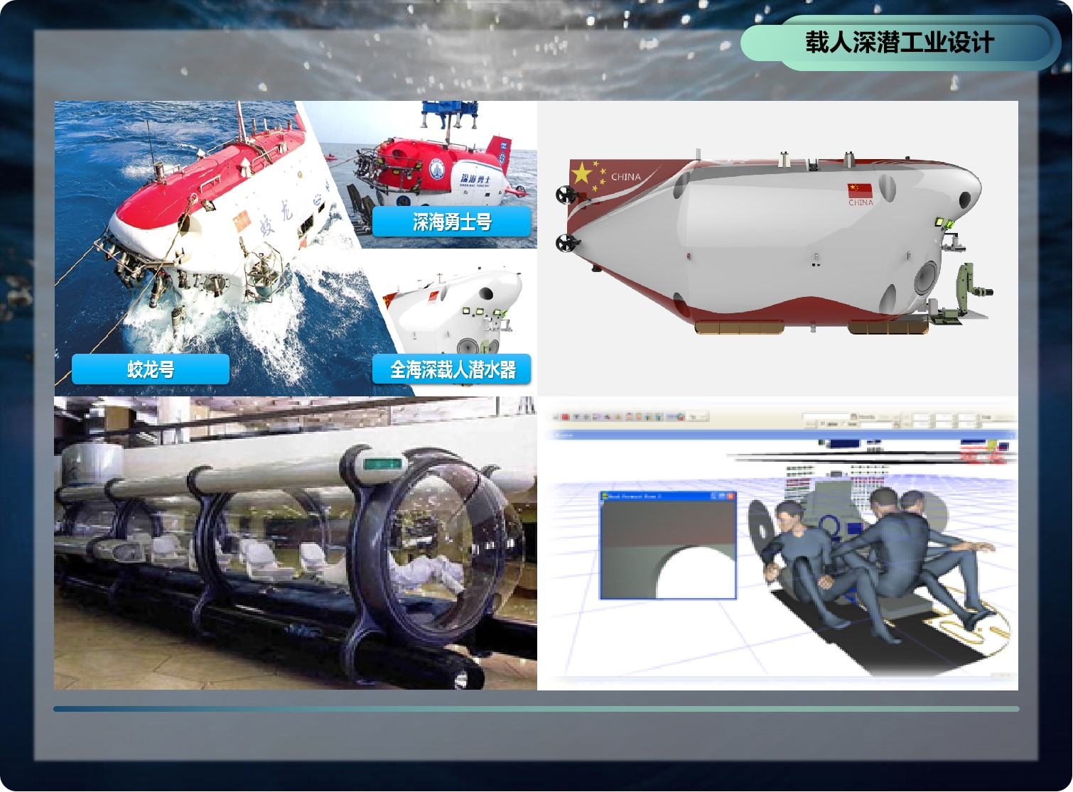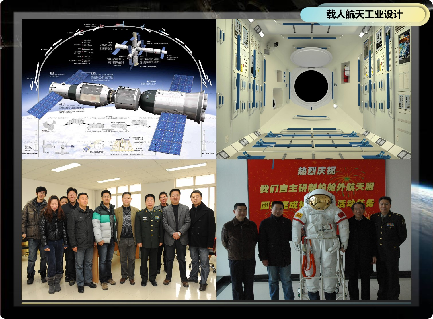 “中心”团队先后承担了国家“863计划”、国家科技支撑计划、国家重点研发专项、国家自然科学基金,国家载人航天、航空、载人深潜工程和国防基础科研等重大科技攻关项目数十项,科研成果广泛应用于我国载人航天神舟飞船、天宫一号目标飞行器、空间站、多型号军机与支线客机、全系列载人深潜器、地面装甲车辆等国家重大工程和高科技领域,形成“上天入海”特色工业设计模式。